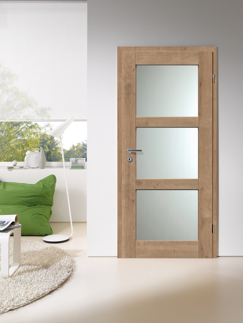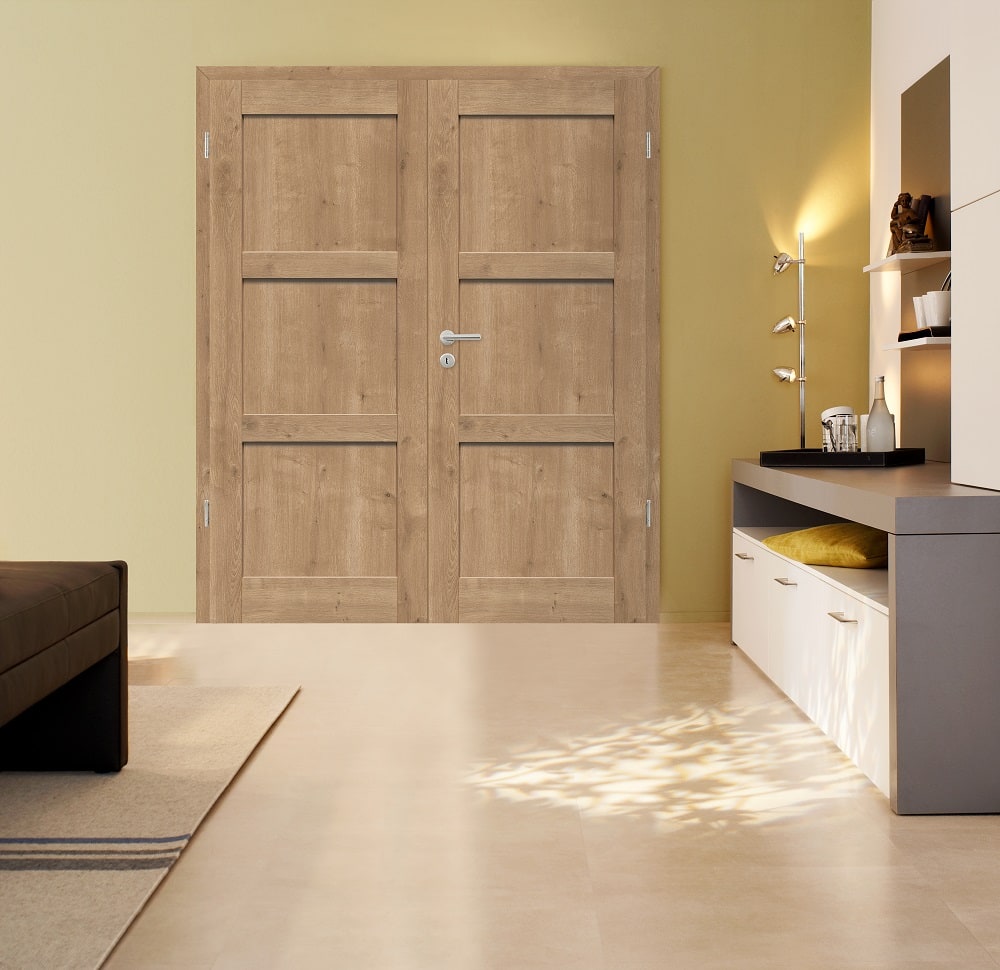Eine Rahmentür mit eingeschobenen Füllungen. Die optisch täuschend echte Maserung und fühlbare Holzstruktur der Ast-Eiche CPL, eine kontrastreiche Holzoptik-Oberfläche mit dargestellten Asteinschlüssen, passt sich perfekt an die klassische Rahmentür an. So entsteht in Räumen ein neues Rundum-Wohlfühlambiente.
